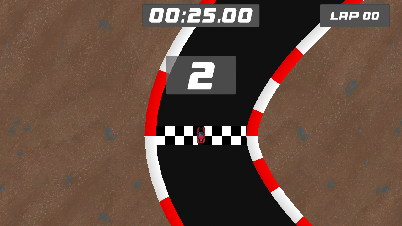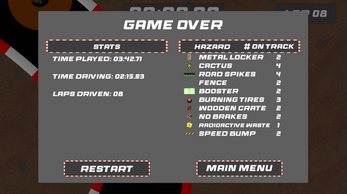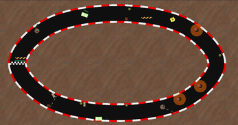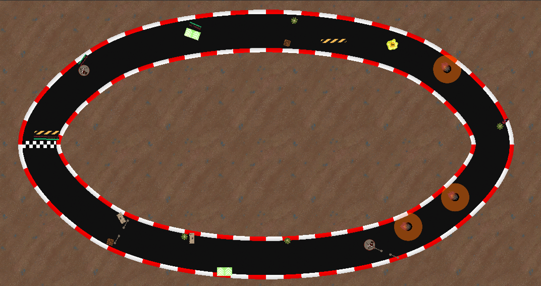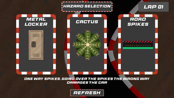 Complete a loop of the race track before the time runs out. Every loop you drive, three hazards will be added to the track, and you only get to choose where to place one of them.